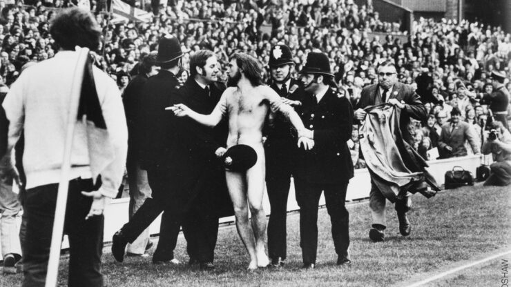 Fotografia di Ian Bradshaw, Twickenham, sobborgo di Londra, febbraio 1974. Il protagonista dello scatto è Micheal O’Brien, un uomo australiano che in quel contesto fece qualcosa che nessuno aveva fatto prima di lui, almeno davanti ad un obbiettivo fotografico. Come forma di protesta stravagante, o solo alla ricerca di flebili attenzioni, Micheal corse totalmente nudo per il campo.